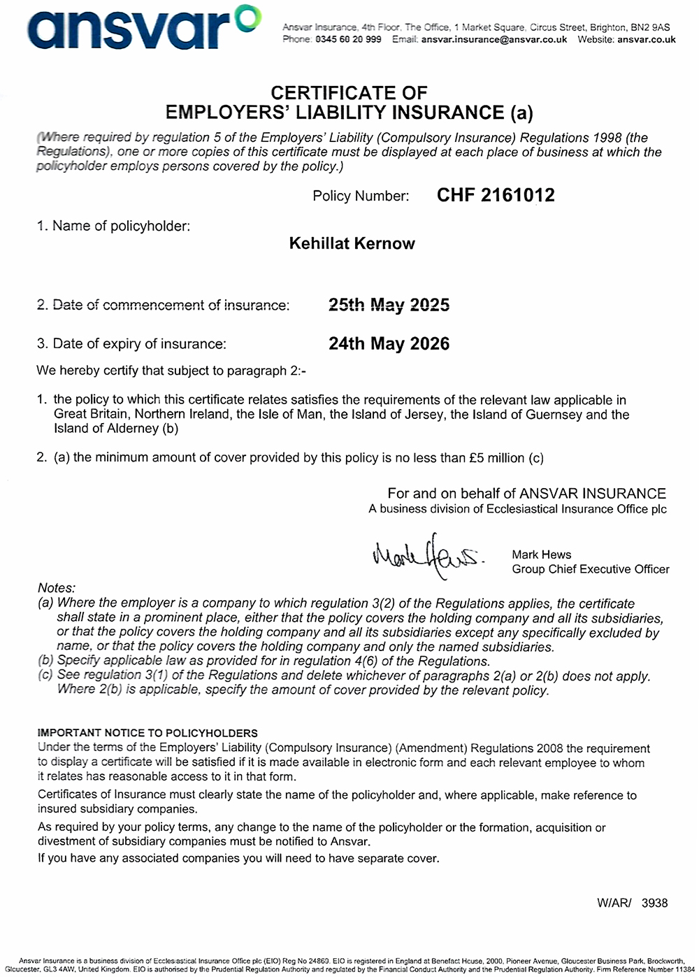 Certificate of Employers’ Liability InsuranceCurrent certificate Here is a copy of the current Certificate of Employers’ Liability Insurance covering the current year from Ansvar.Legal documentation We have all our legal documentation in one place from privacy to safeguarding. View legal documentation