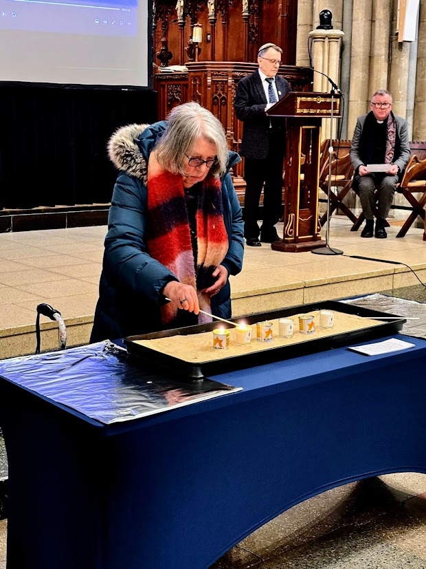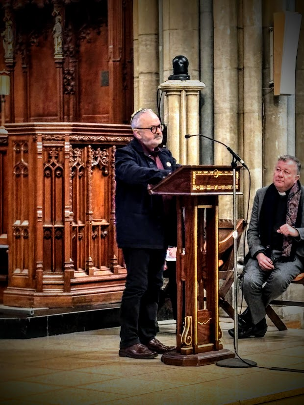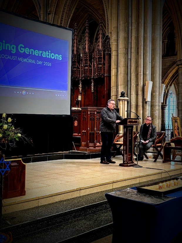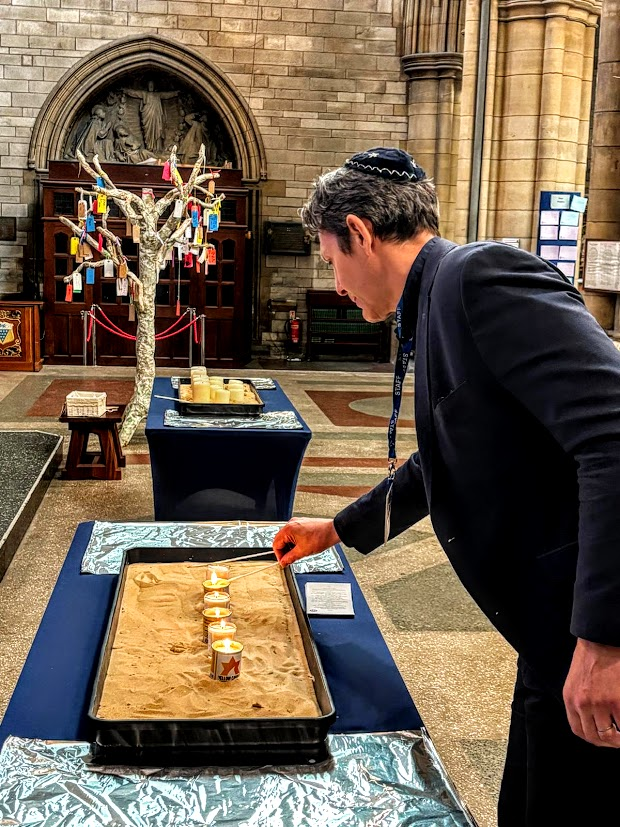 The well-attended service, whose theme was ‘Bridging Generations’, was led by Simon Robinson, the Dean of Truro Cathedral, and included a video introduction by Rob Rinder, poignant personal testimonies from Cynthia Hollinsworth and Susan Soyinka, poetry from Ben Barkow, and readings by students from Truro School. Six memorial candles were lit in memory of the 6 million inncluding one by Renate Collins, a Holocaust survivor, and then Jeremy Jacobson, the Kehillat Kernow Chair spoke. He was followed by Paul Kleiman singing ‘El Molei Rachamim’ the Jewish prayer recited at funerals and which has been specially adapted for HMD (see video at end of photos). The service ended with Adam Feldman reading out the traditional priestly blessing. Those attending then lined up to light memorial candles and to write pledges for action.